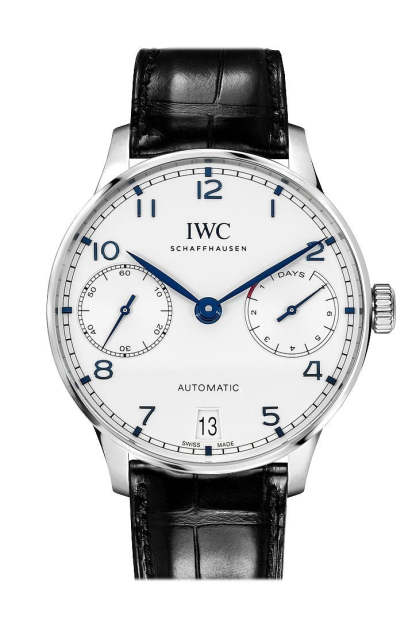 Stainless steel case with a black alligator leather strap. Fixed stainless steel bezel. Silver dial with blue hands and Arabic numeral hour markers. Minute markers around the outer rim. Dial Type: Analog. Date display at the 6 o'clock position. Two sub-dials displaying: 7 day power reserve and 60 second. Automatic movement with a 168-hour power reserve. Scratch resistant sapphire crystal. Push / pull crown. Skeleton case back. Case diameter: 42.3 mm. Case thickness: 14.5 mm. Round case shape. Fold over clasp with safety release. Water resistant at 30 meters / 100 feet. Functions: date, hour, minute, second. Luxury watch style. Watch label: Swiss Made. Watch Automatic Black Strap Mens Watch IW500705.